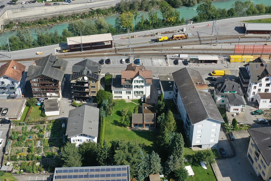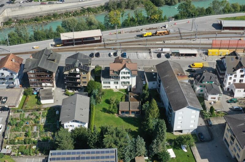 Das Grundstück befindet sich an zentralster Lage direkt am Bahnhof und bietet somit beste Verkehrsanbindung an die gesamte Region durch Bahn, Postauto und Auto. Zudem befinden sich weiterführende Schulen und das Regionalspital, als grösster Arbeitgeber der Region, in Gehdistanz.
