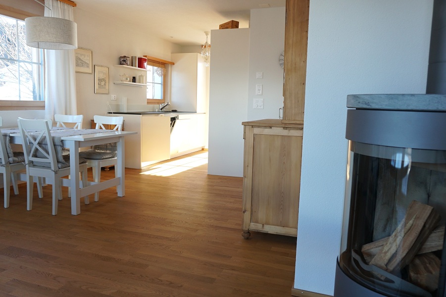 Ein besonderes Highlight ist der gemütliche Schwedenofen im Wohnzimmer, der an winterlichen Tagen für wohlige Wärme sorgt. Vom Wohnbereich gelangt man direkt auf die Terrasse (18.3 m²) mit herrlichem Blick in die Bergwelt. Der über die Küche zugängliche Sitzplatz (9.4 m²) bietet zusätzlichen Aussenraum zum Entspannen. Bei genügend Schneelage ist Ski-in/Ski-out möglich. Im Haus stehen eine allgemeine Waschküche und ein praktischer Skiraum zu allgemeiner Nutzung zur Verfügung.